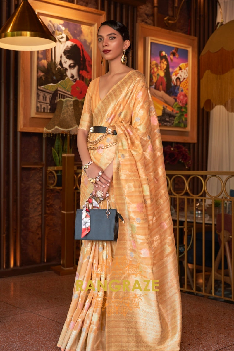 Golden Beige Woven Banarasi Linen Silk Saree