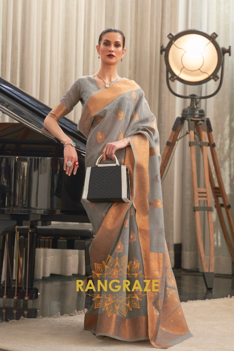 Slate Grey Pure Linen Copper Zari Banarasi Weaving Saree