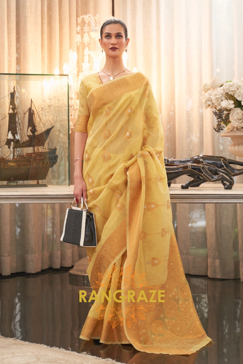 Golden Yellow Banarasi Linen Woven Silk Saree