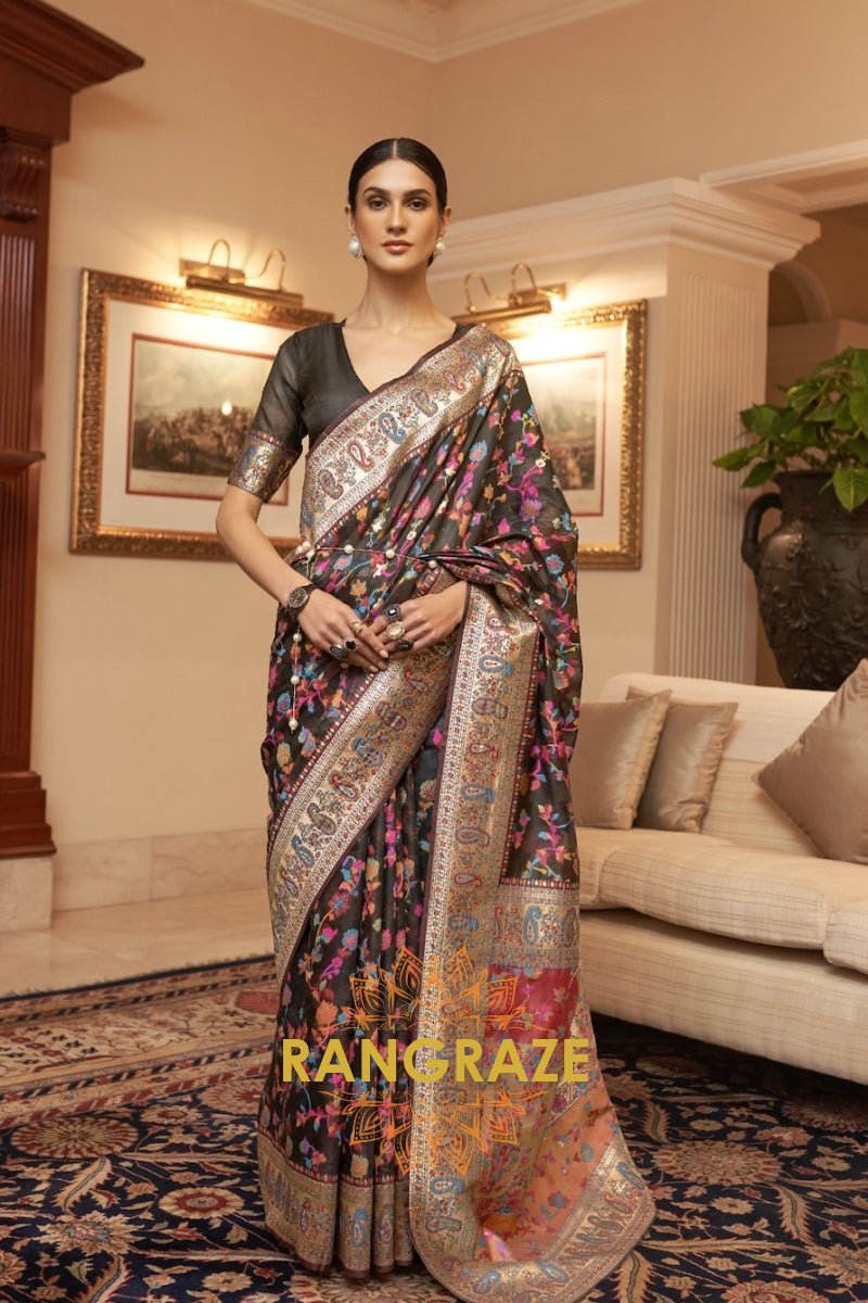 Raven Black Multi Color Woven Pashmina Jamewar Saree