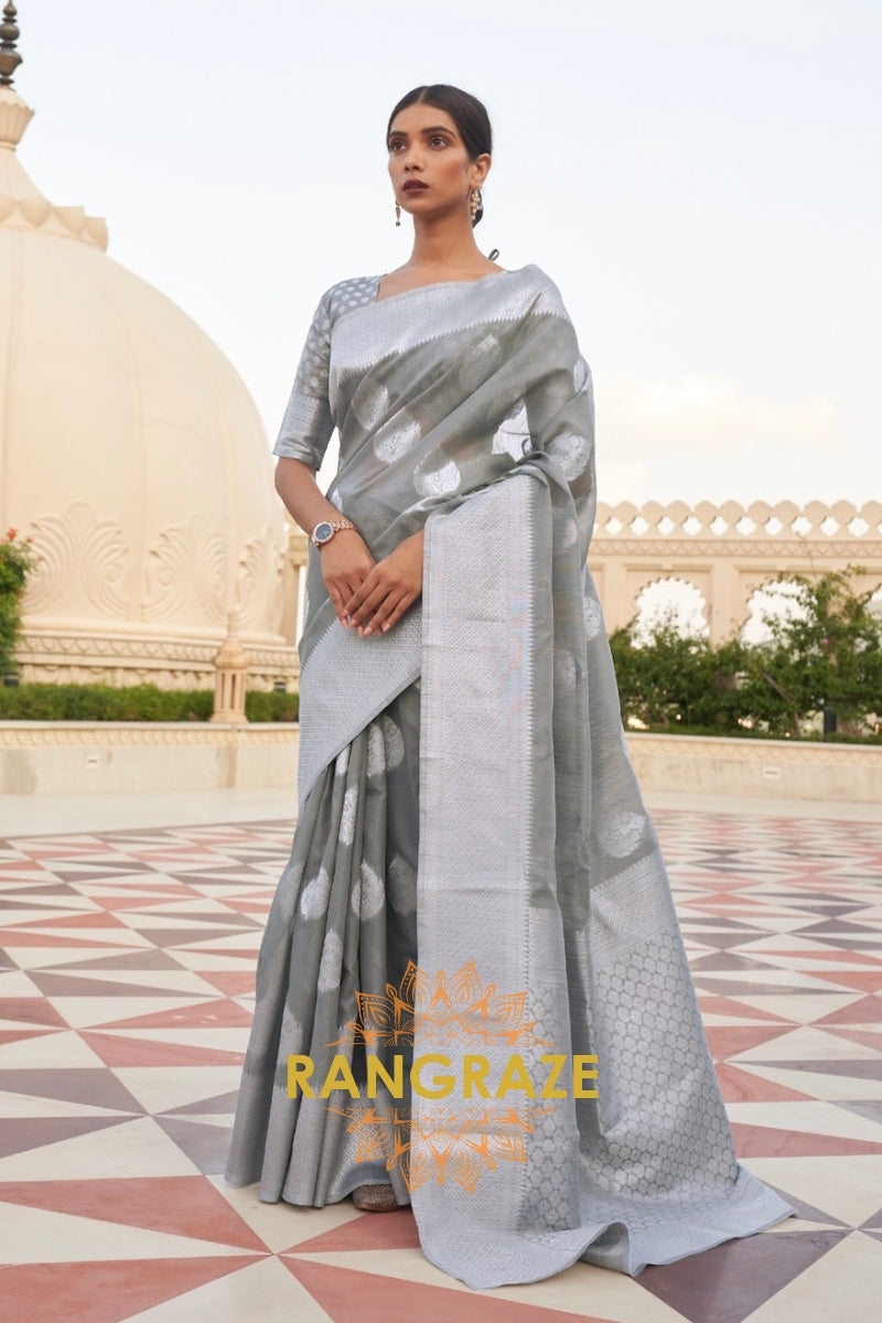 Majestic Grey Banarasi Linen Woven Silk Saree