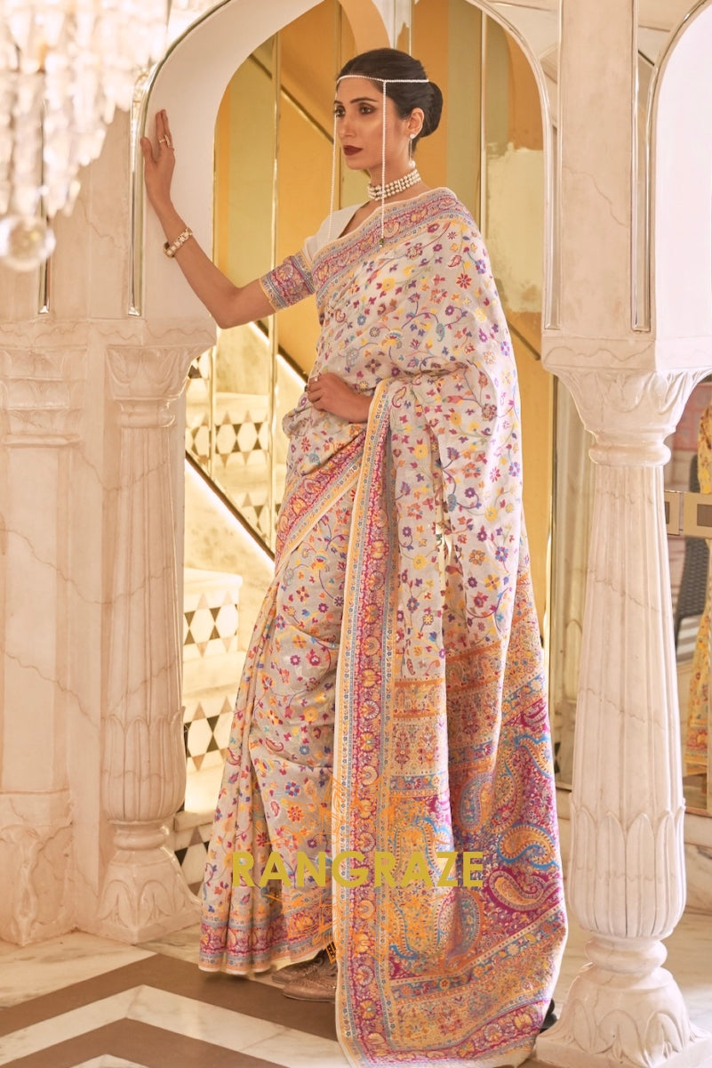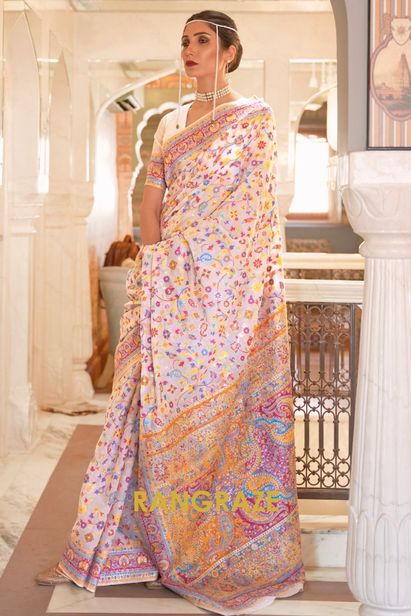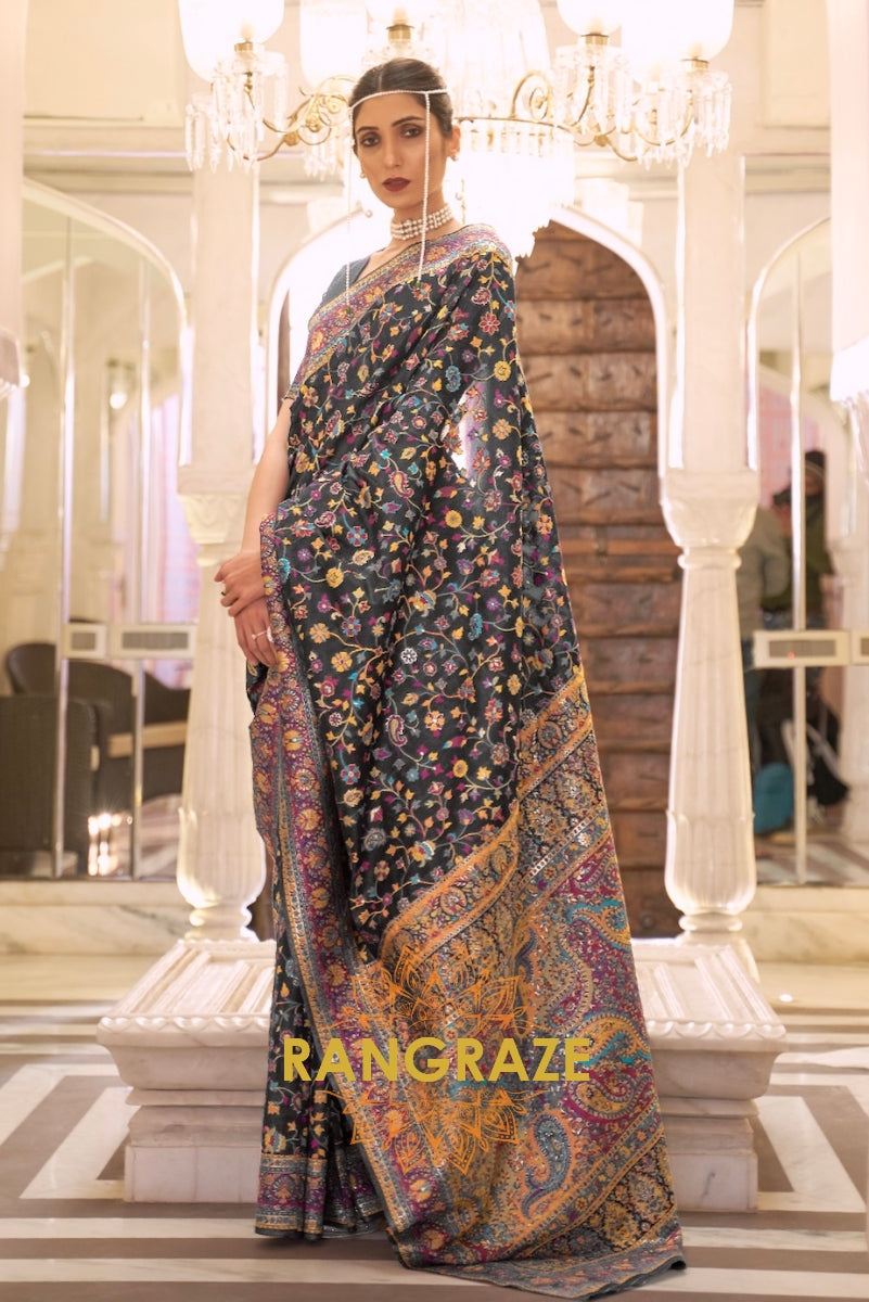 The brocaded sections of Jamawar Sarees are intricately woven using threads of silk or polyester....