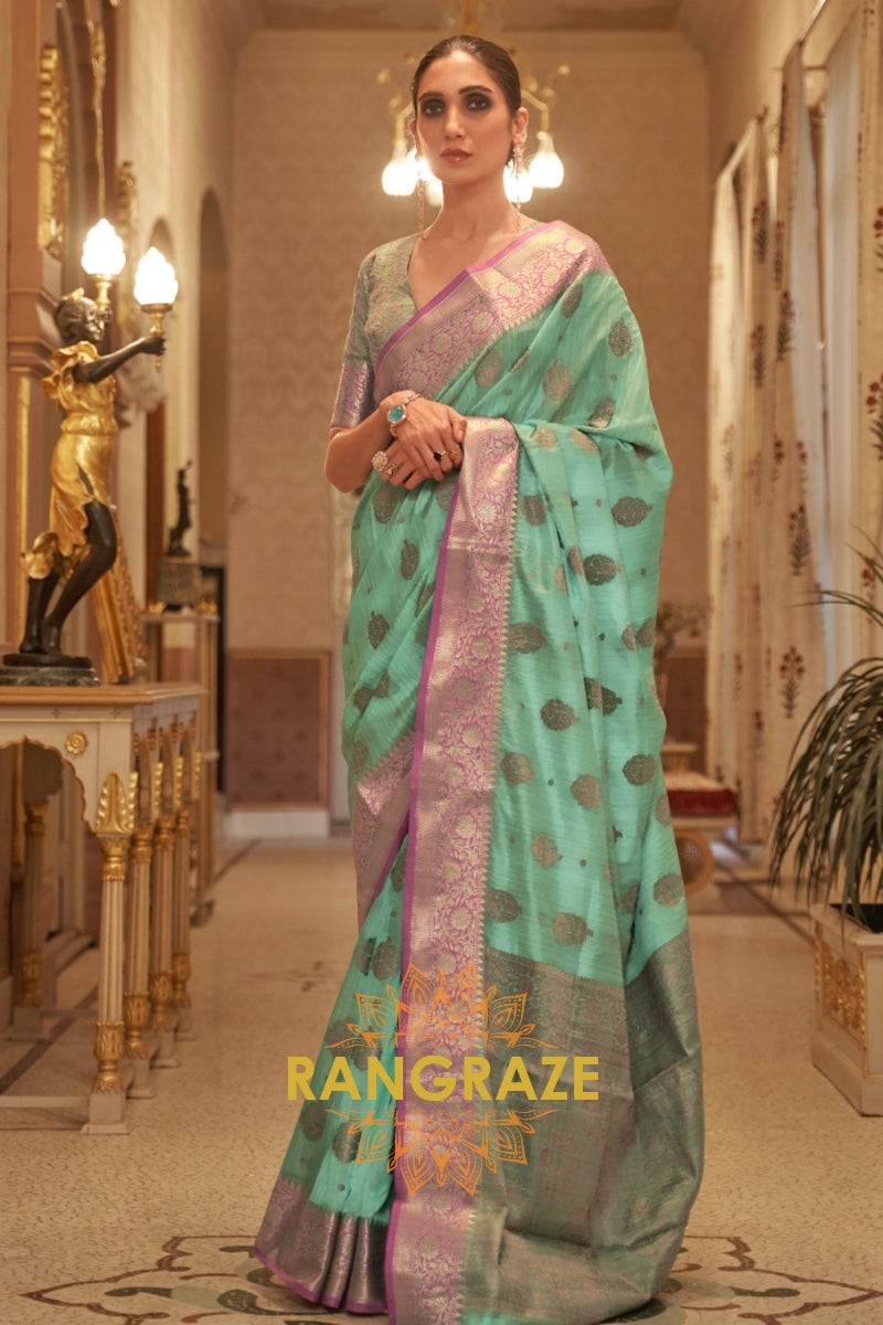 Turquoise Pristine Banarasi Linen Woven Silk Saree