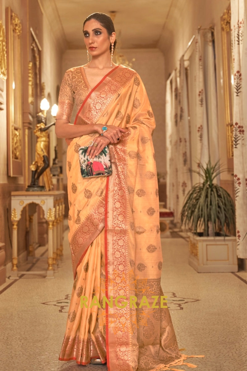 Introducing the "Peach Pink Floral Woven Linen Silk Saree" from Rangraze – a beautiful fusion...