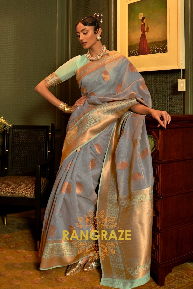 Slate Grey Pure Linen Copper Zari Banarasi Weaving Saree