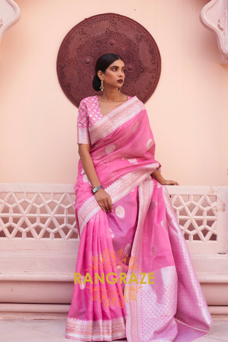 Dazzling Pink Woven Banarasi Linen Silk Saree