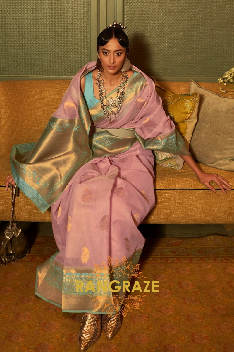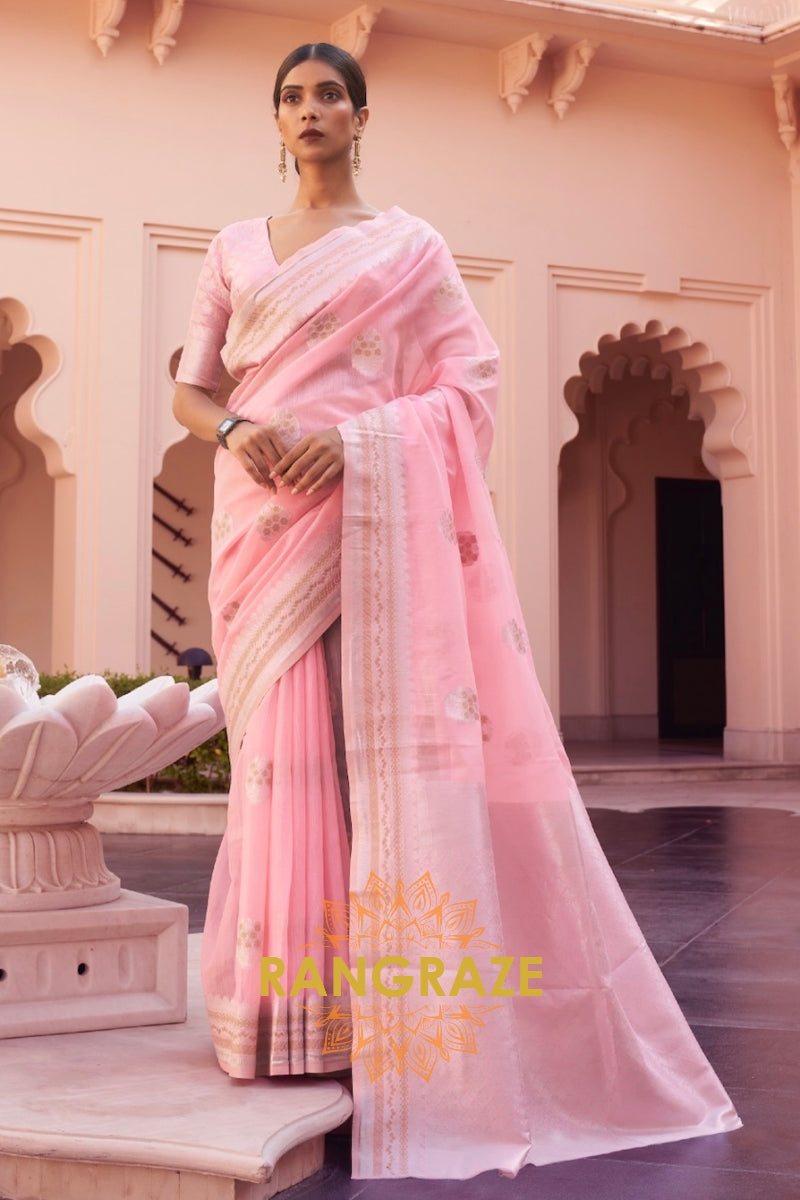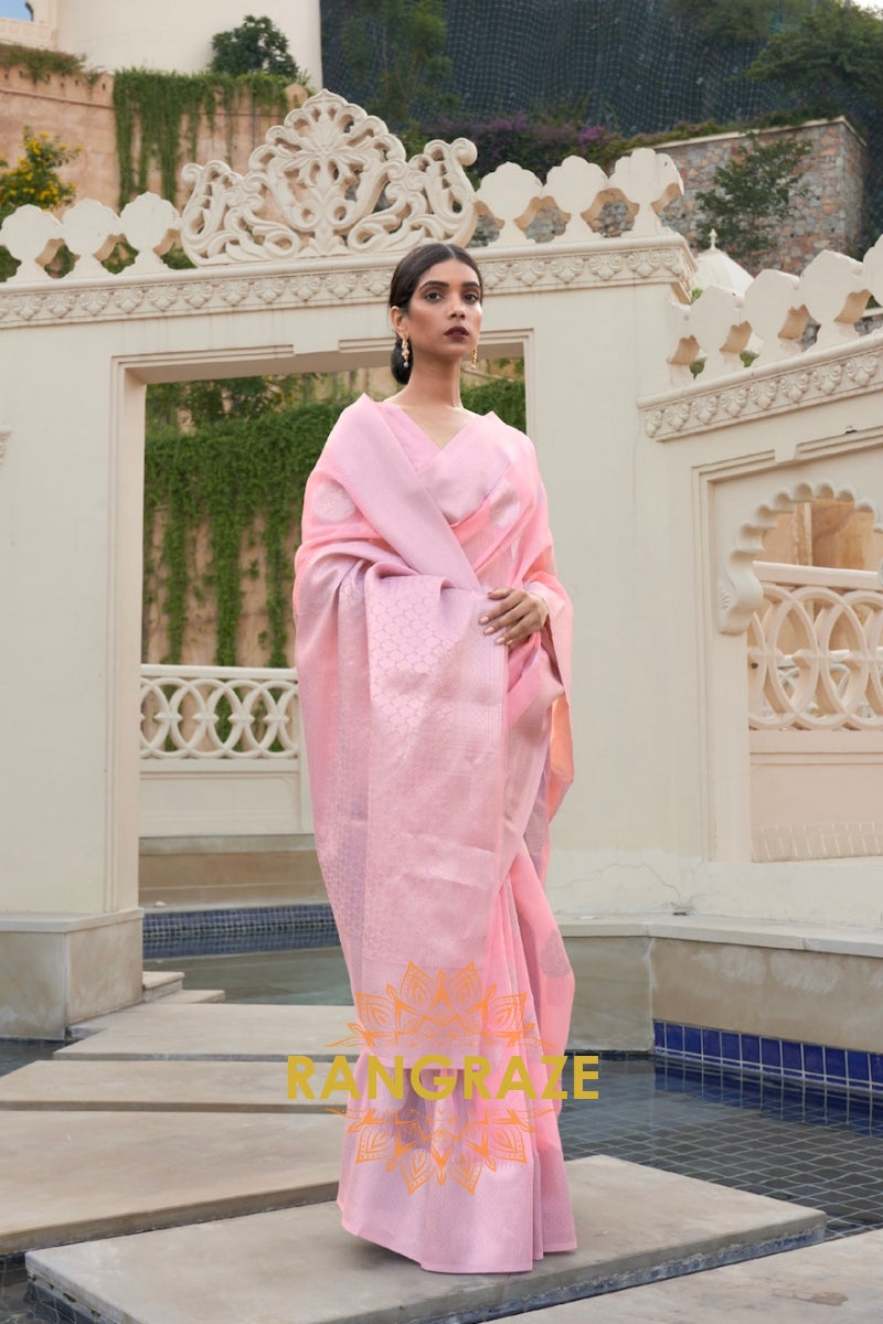 Baby Pink Woven Banarasi Linen Silk Saree