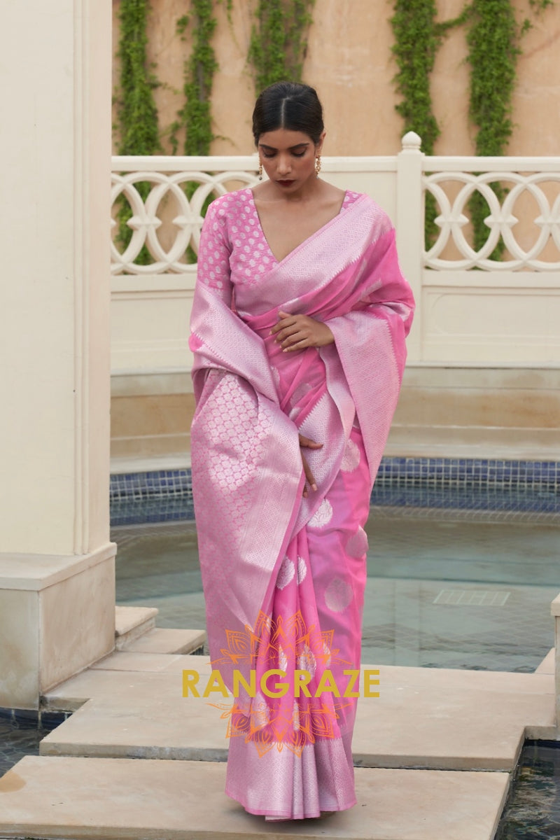 Pristine Pink Banarasi Linen Woven Silk Saree