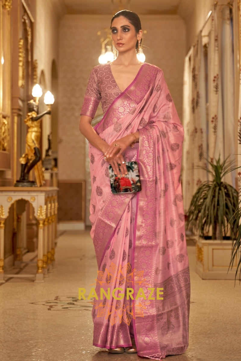 Royal Rose Pink Banarasi Linen Woven Silk Saree