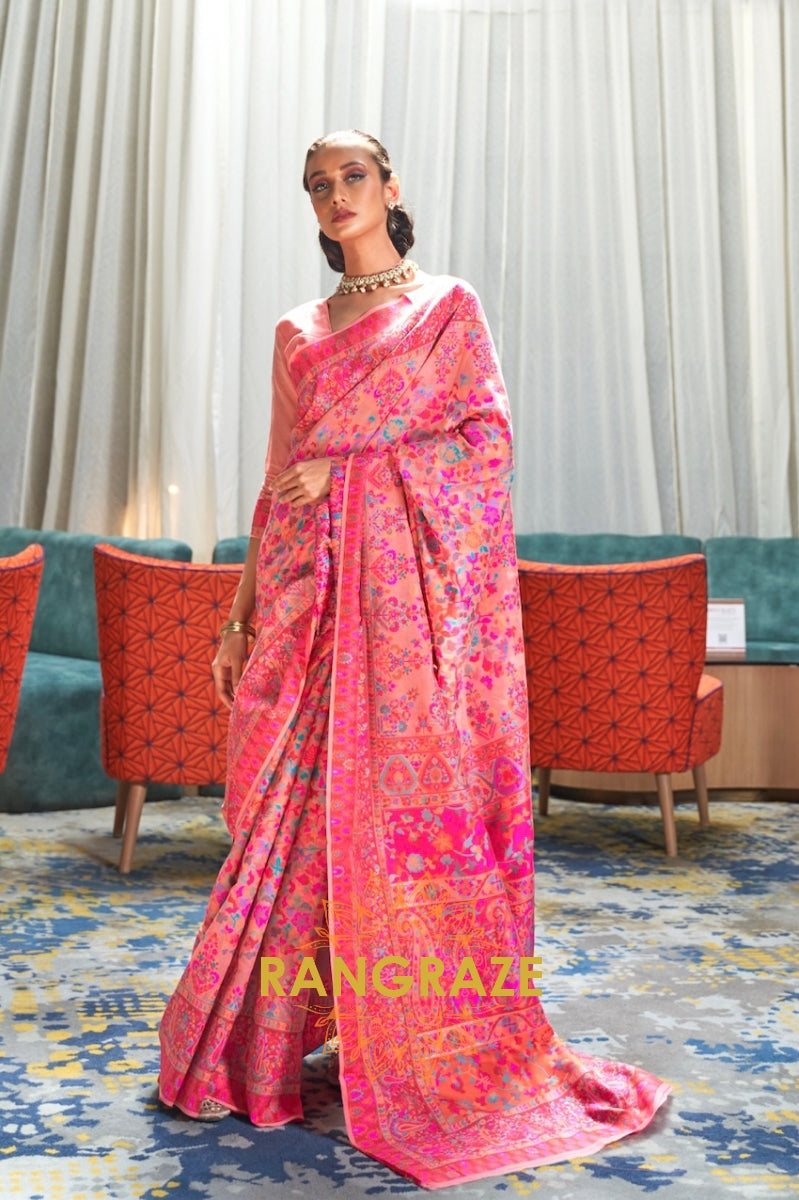 Peach Pink Woven Kashmiri Pashmina Saree