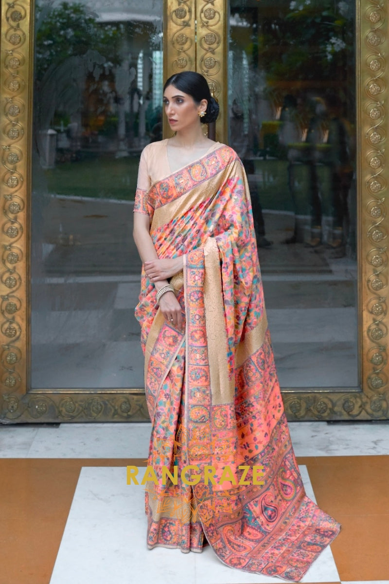 Peach Pink Multi Color Kashmiri Jamewar Weave Saree