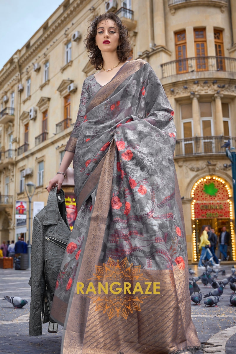 Regal Greyish Green Printed Brasso Handloom Weaving Soft Silk Saree