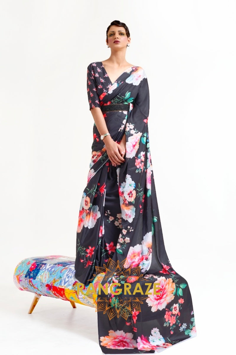 Black Blossom Floral Printed Satin Crepe Saree