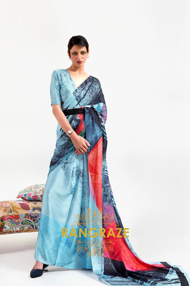 Bright Azure Blue Printed Satin Crepe Saree