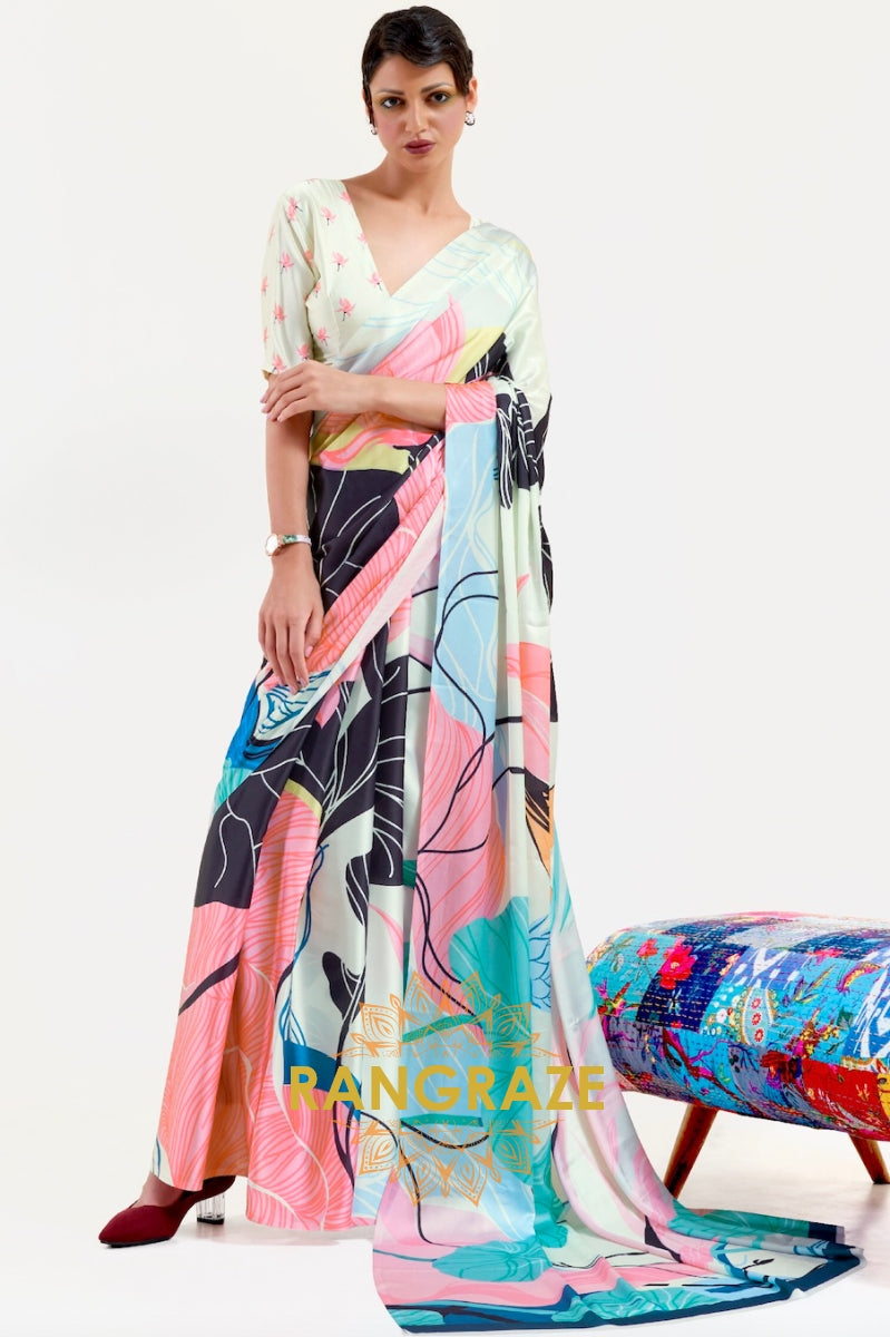 Multi Color Printed Satin Crepe Saree