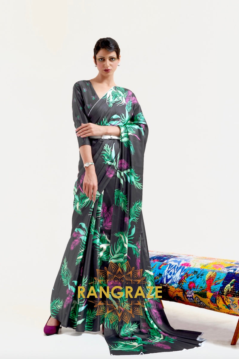 Ebony Black Leafy Printed Satin Crepe Saree
