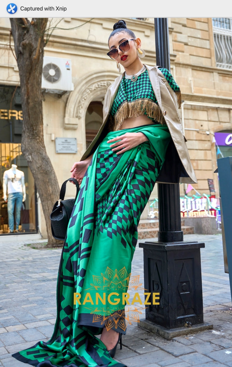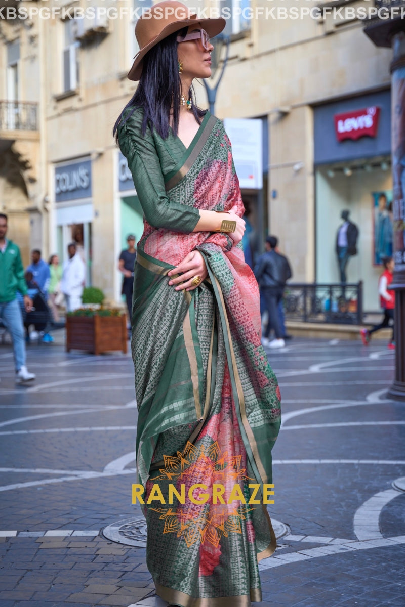 Sparkling Forest Green Soft Satin Silk Print Saree