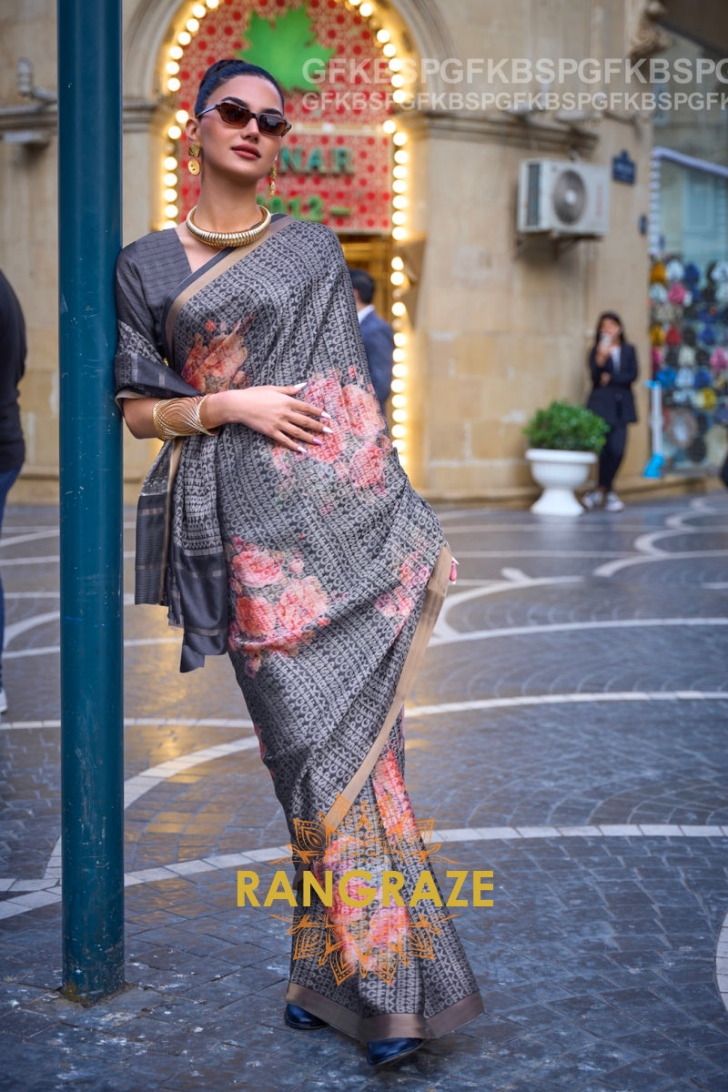 Timeless Grey Pink Print Handloom Weaving Viscose Silk Saree