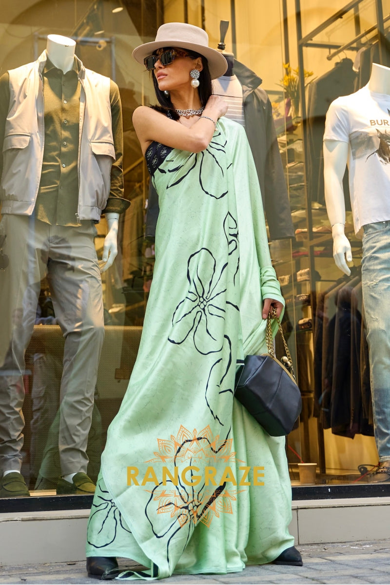 Sparkling Sea Green Soft Satin Silk Print Saree