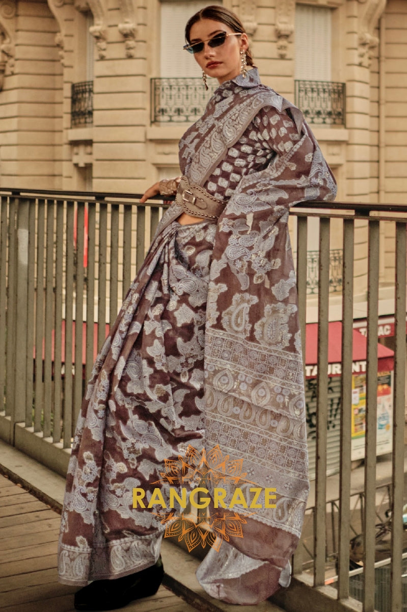 Cherry Brown Woven Lucknowi Organza Silk Saree