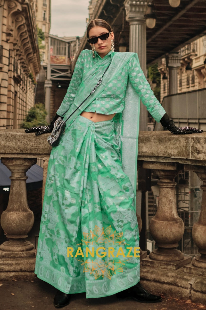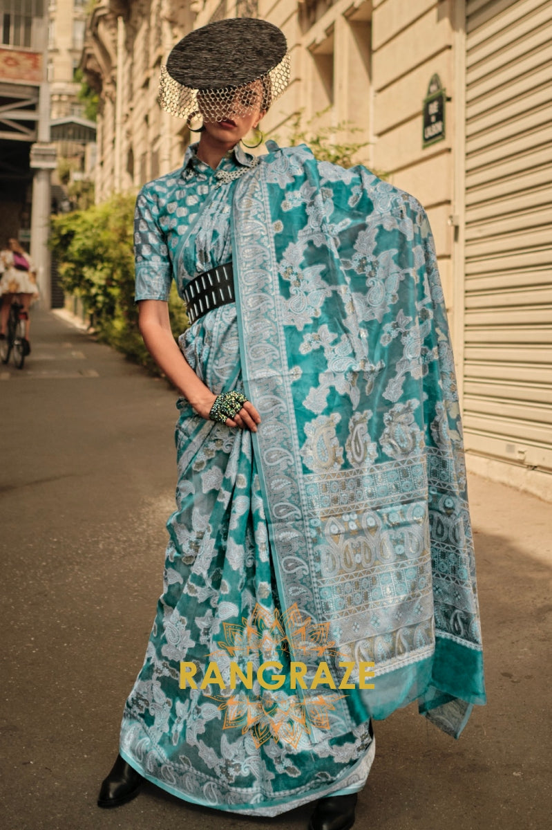 Turquoise Green Woven Lucknowi Organza Silk Saree
