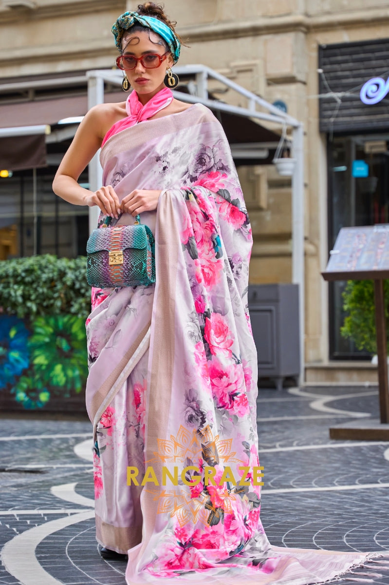 Embrace understated elegance with the Light Grey Floral Printed Satin Georgette Saree. This exquisite saree...