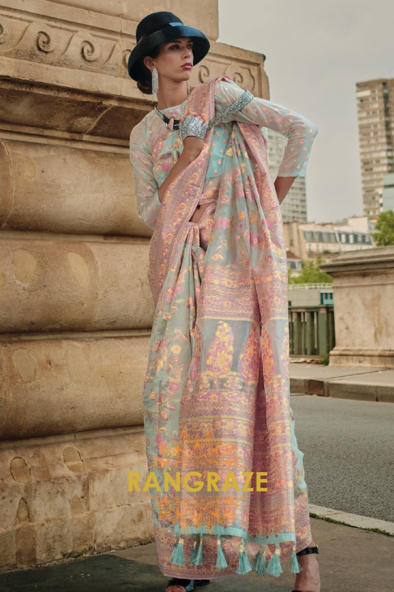 Rajwada Turquoise Blue Kashmiri Organza Handloom Weaving