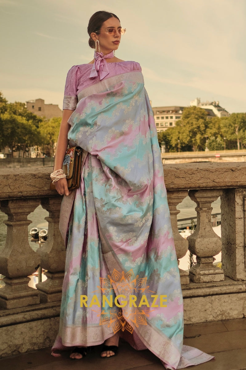 Imperial Pink Blue Rangkat Satin Handloom Weaving Silk Banarasi Saree