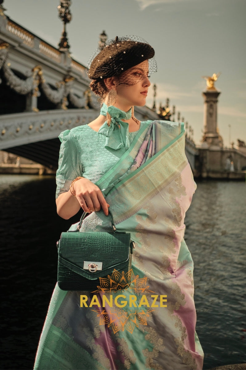 Orchid Sea Green Floral Print Satin Organza Weaving Saree