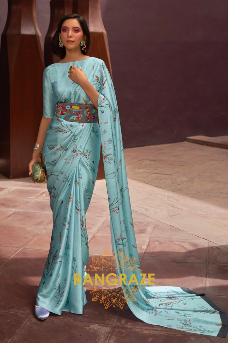 Sparkling Sky Blue Soft Satin Silk Print Saree