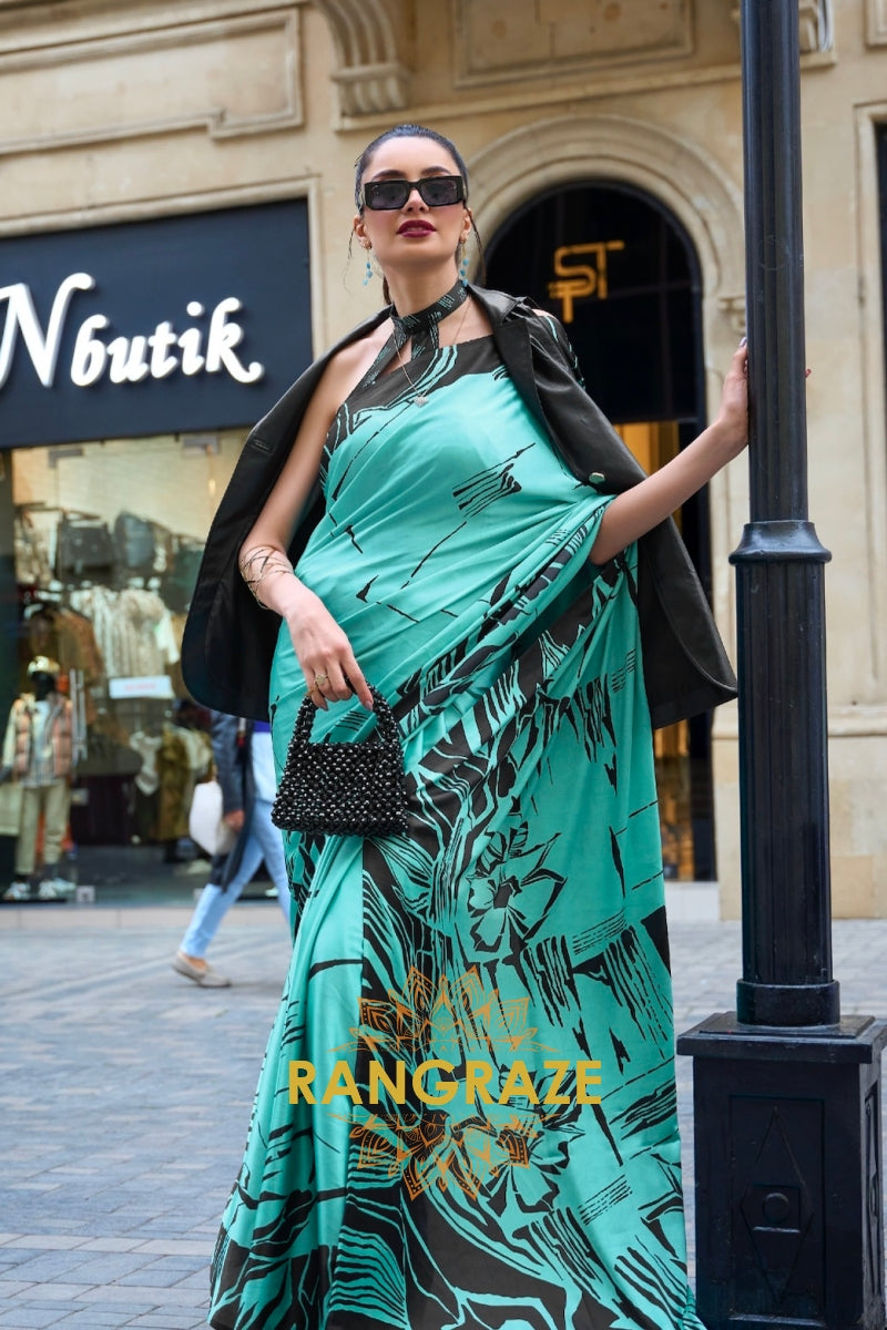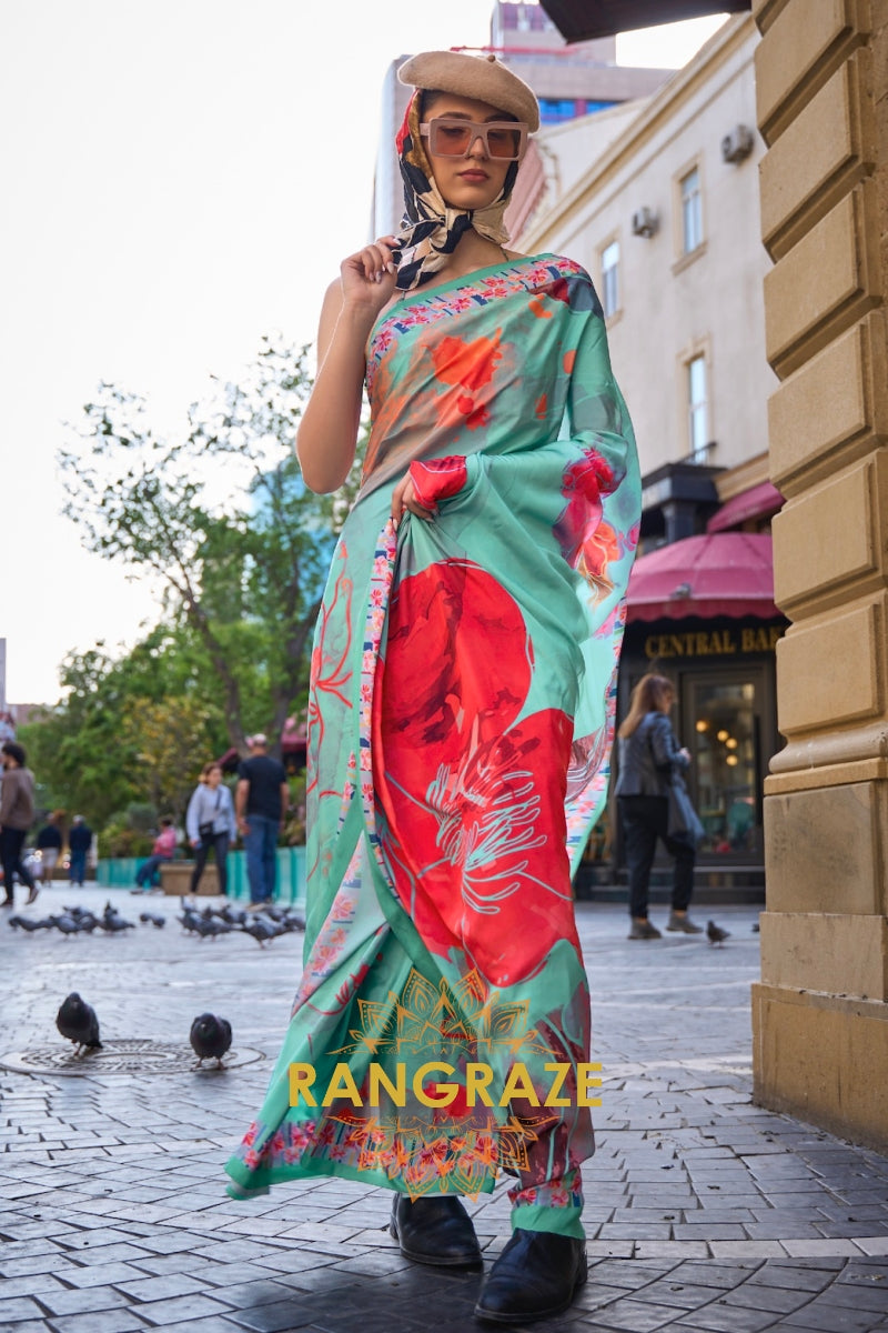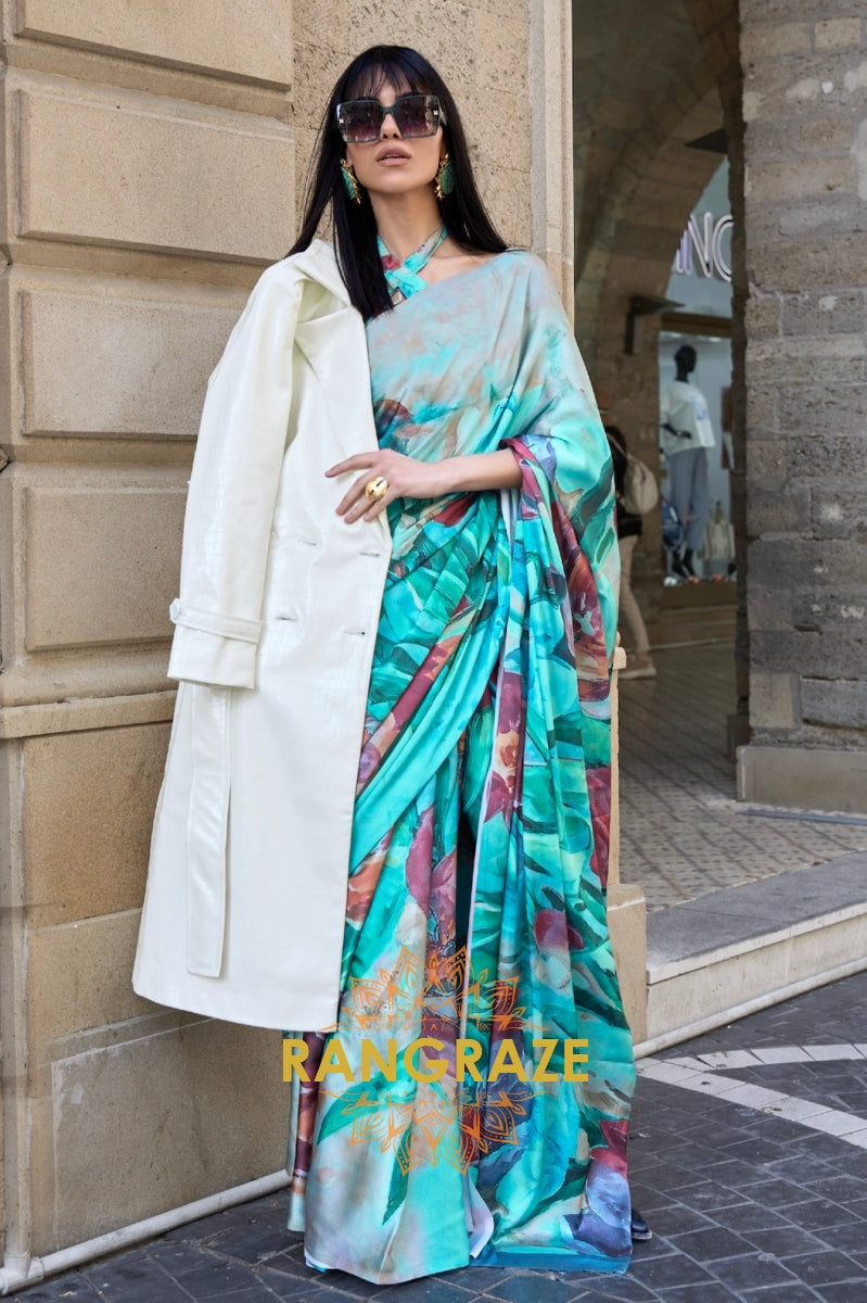 Stunning Turquoise Digital Print Satin Soft Silk Saree