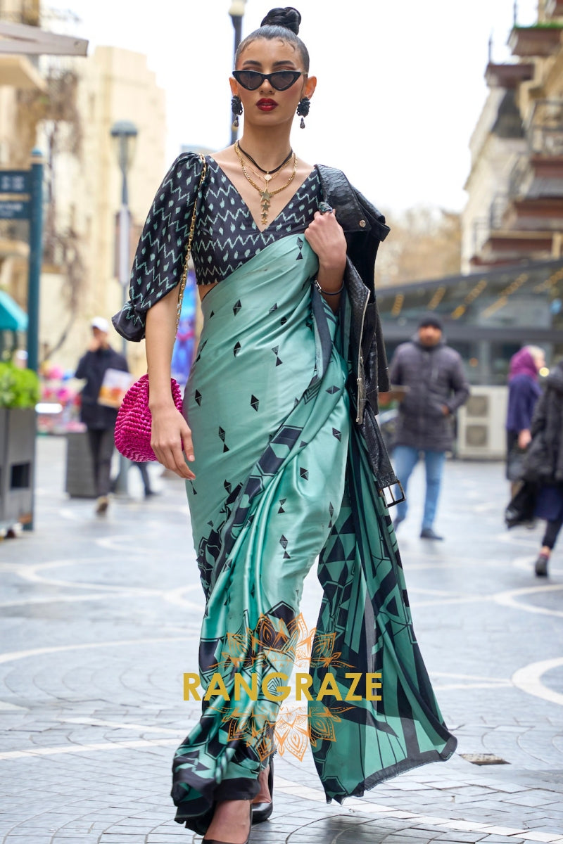 Turquoise Green Apex Pure Satin Silk Digital Print Saree