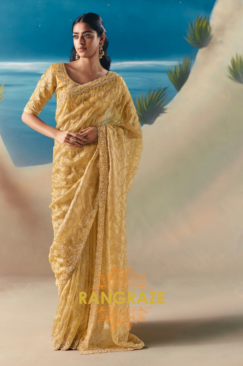 Golden Glow Satin Organza Saree with Sequin & Stone Embroidery