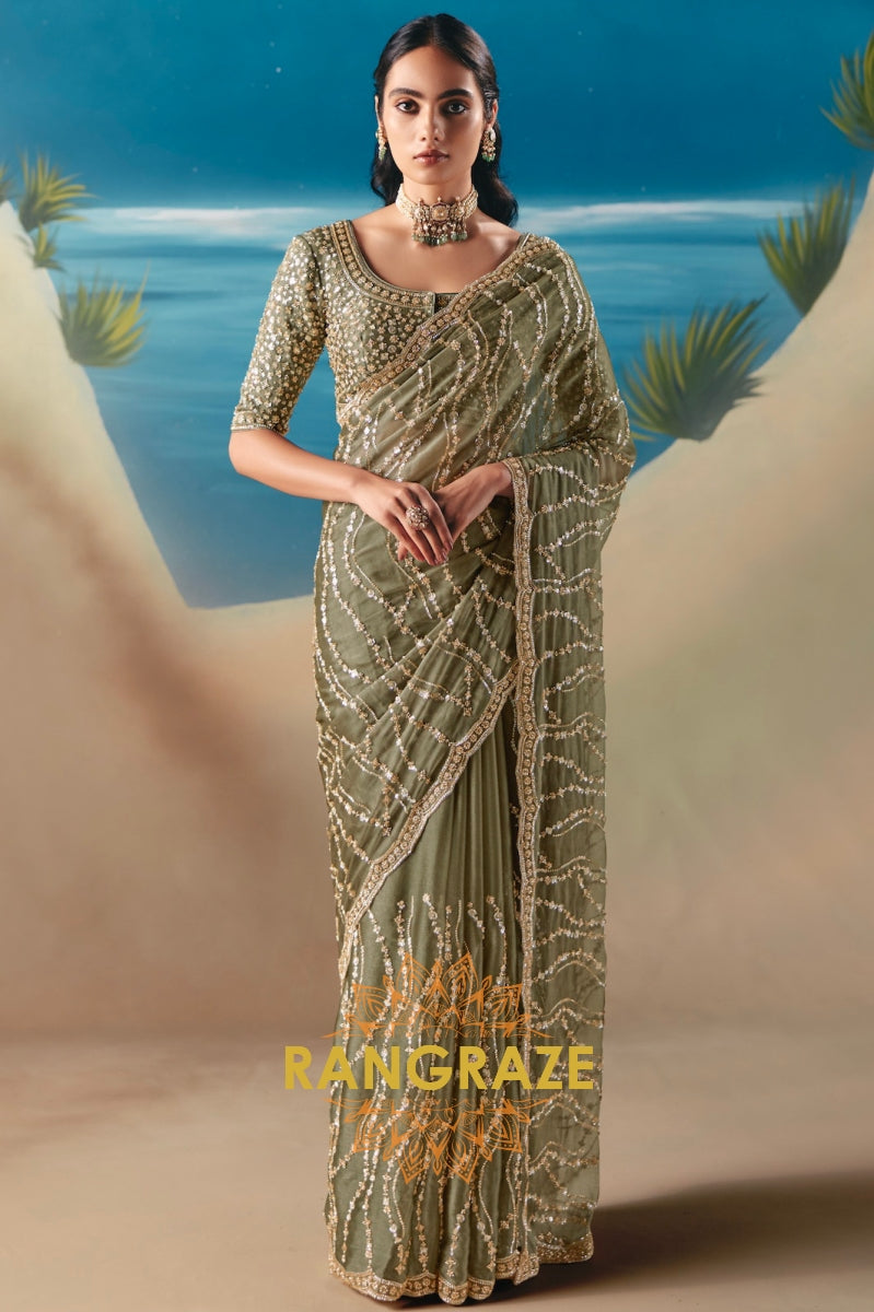 Olive Mist Satin Organza Saree with Intricate Sequin & Bead Work