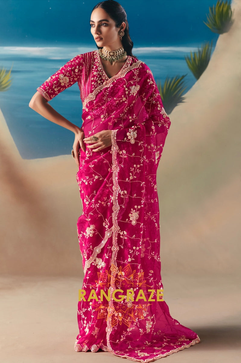 Radiant Fuchsia Satin Organza Saree with Intricate Embroidery & Sequin Detailing