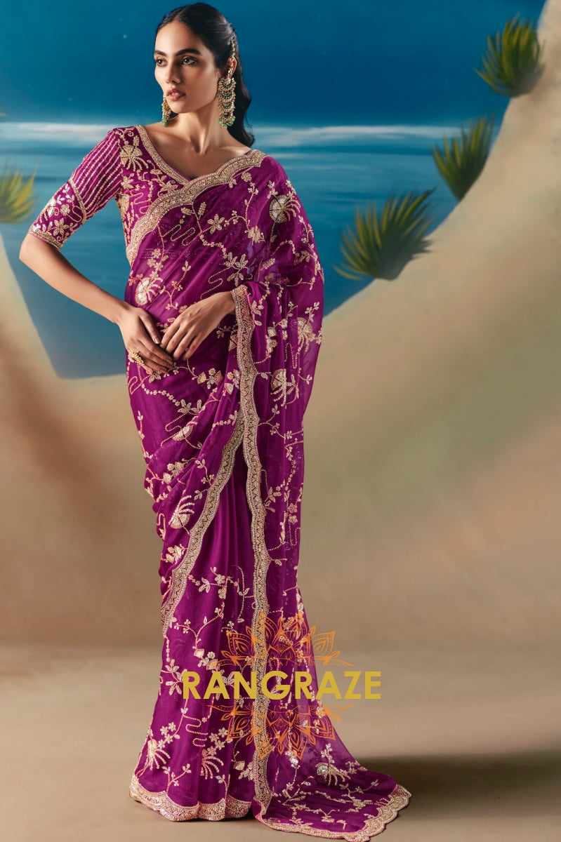 Regal Plum Satin Organza Saree with Designer Embroidery & Sequin Stone Work