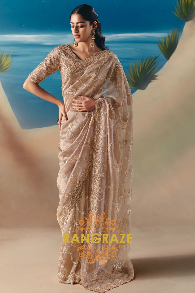 Champagne Glow Satin Organza Saree with Beaded Embroidery & Sequin Highlights