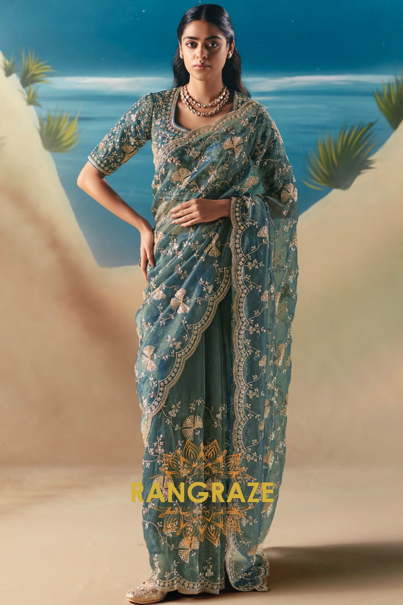 Immerse yourself in oceanic elegance with this Seafoam Shimmer Satin Organza Saree, a masterpiece of...