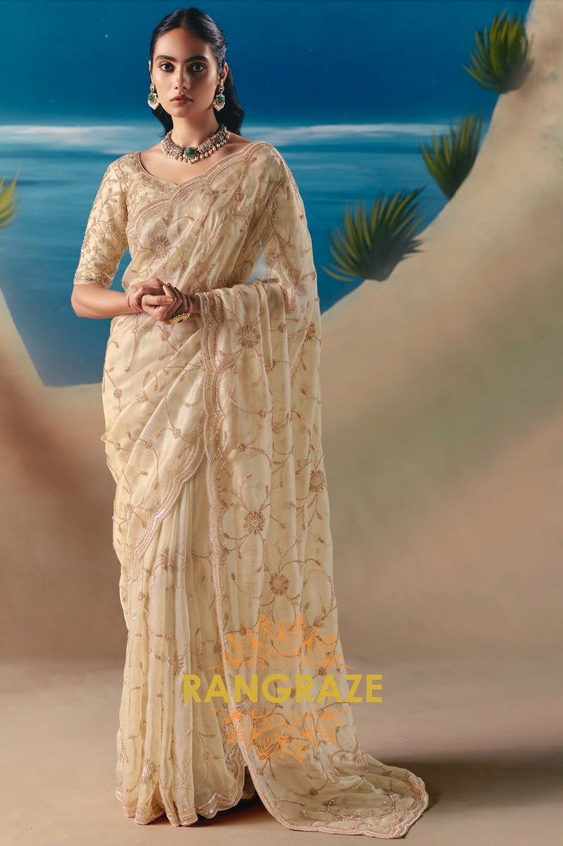 Ivory Gleam Satin Organza Saree with Champagne Sequin Embroidery