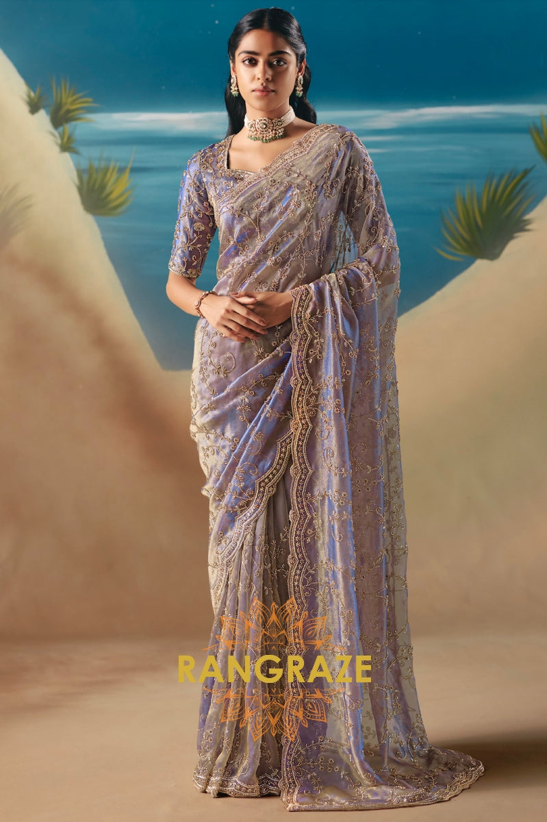Step into a world of ethereal elegance with this Lilac Mist Satin Organza Saree, where...