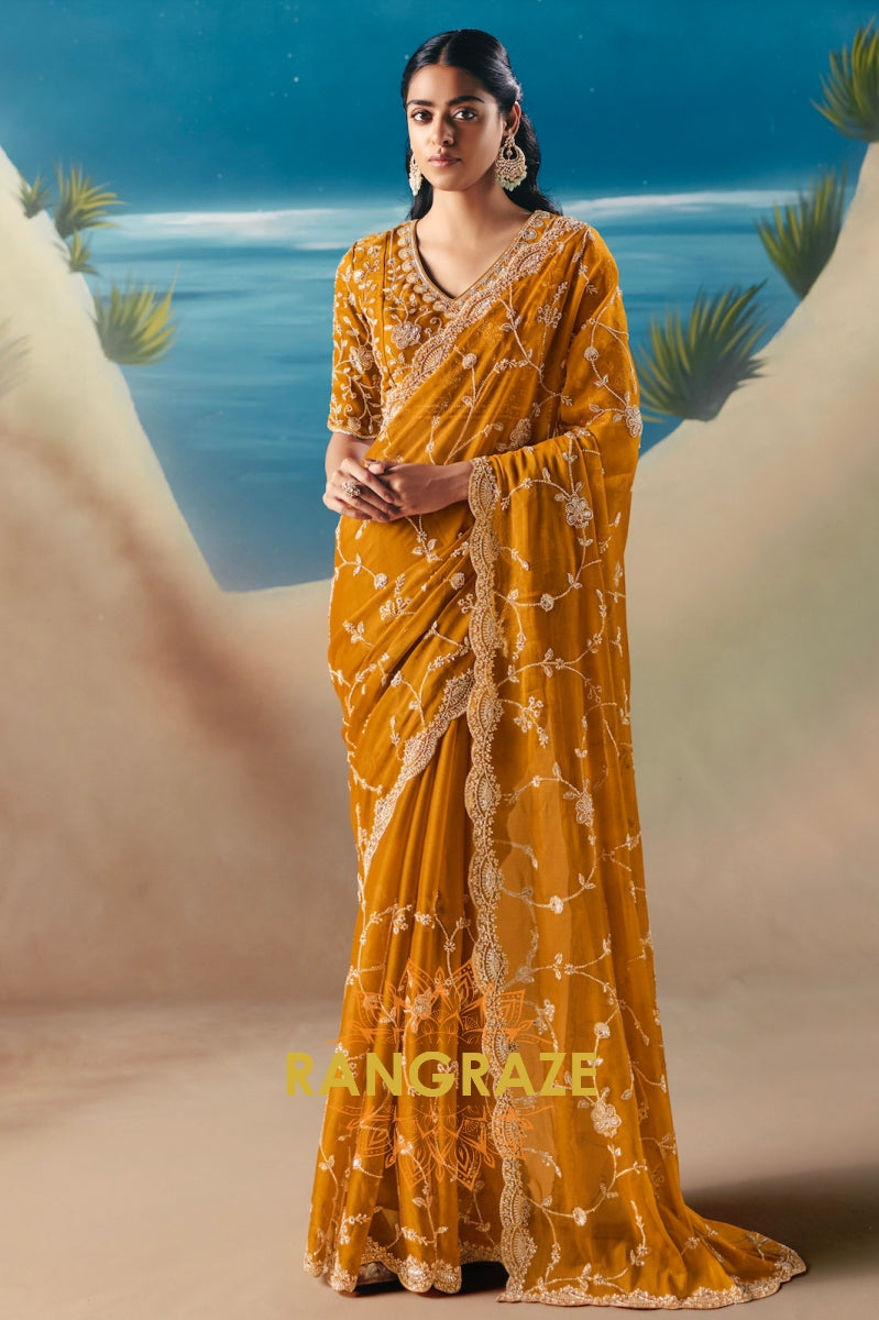 Amber Glow Satin Organza Saree with Pearl and Sequin Embroidery