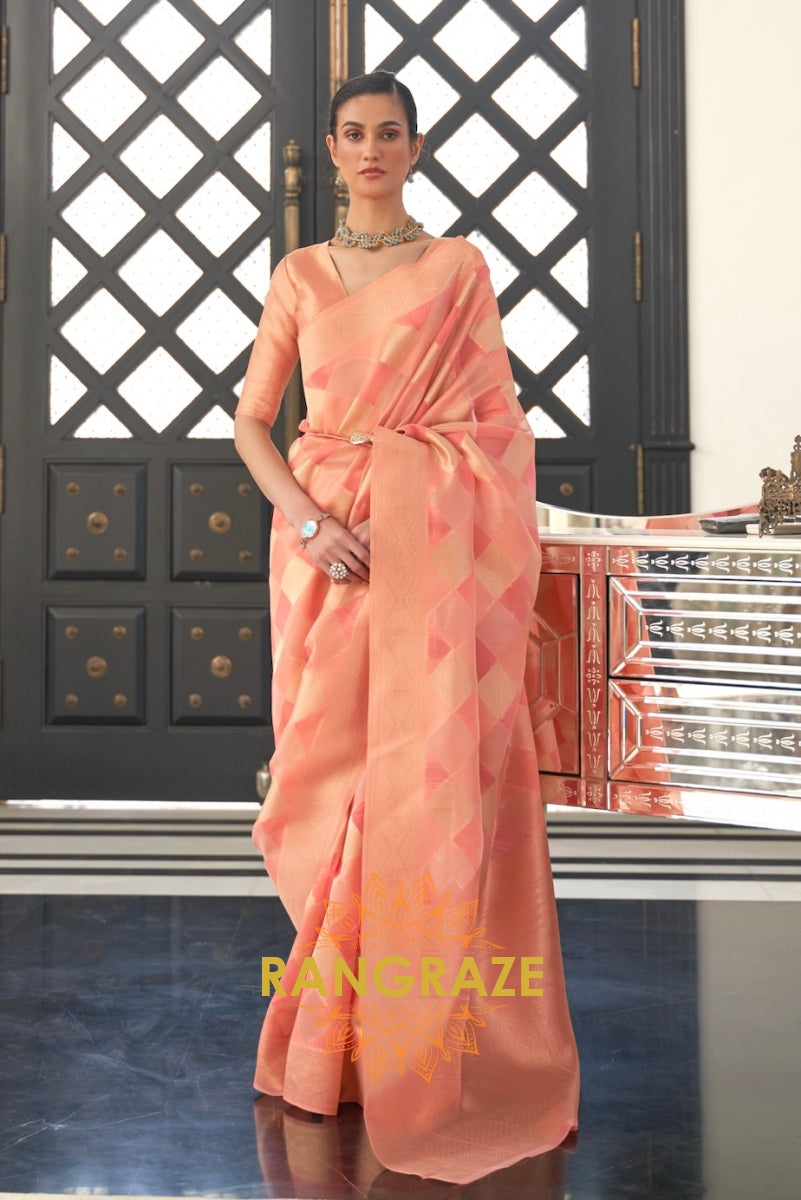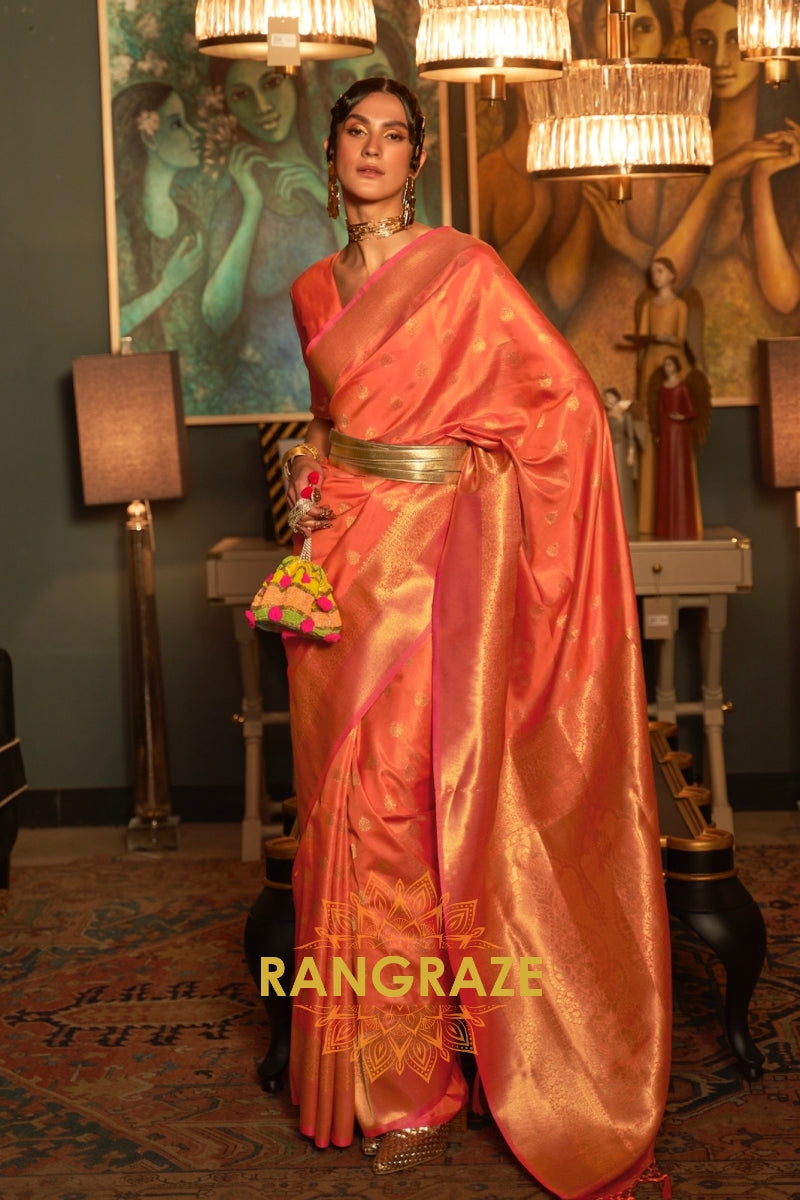 Radiant Coral Peach Woven Banarasi Handloom Silk Wedding Saree