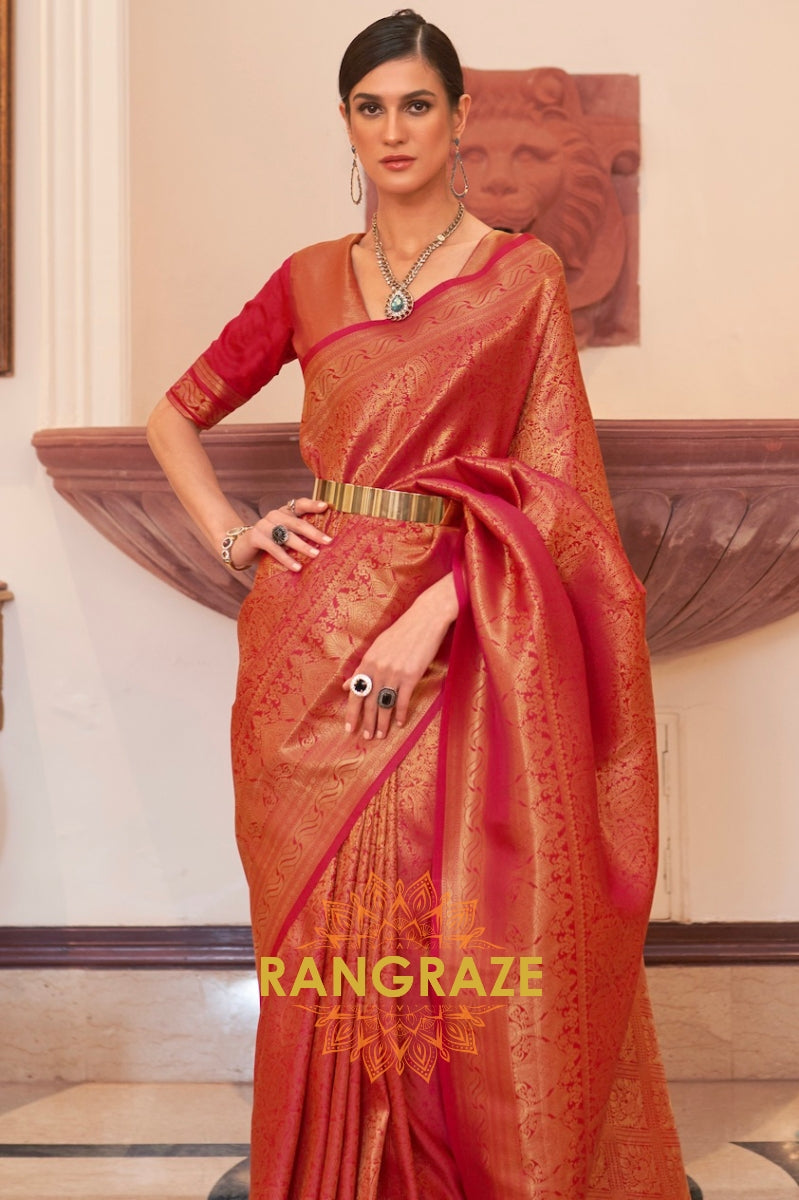 Glitter Orange Red Handloom Weaving Kanjivaram Silk Saree