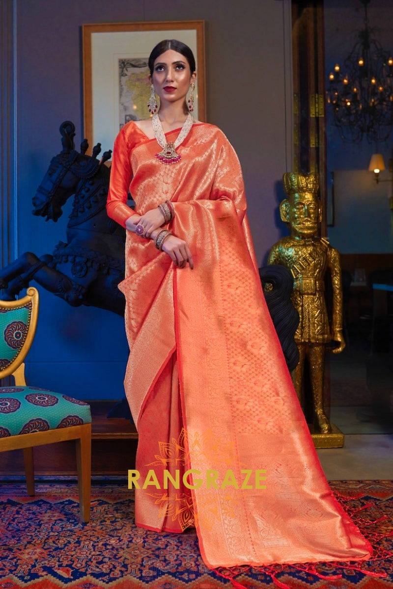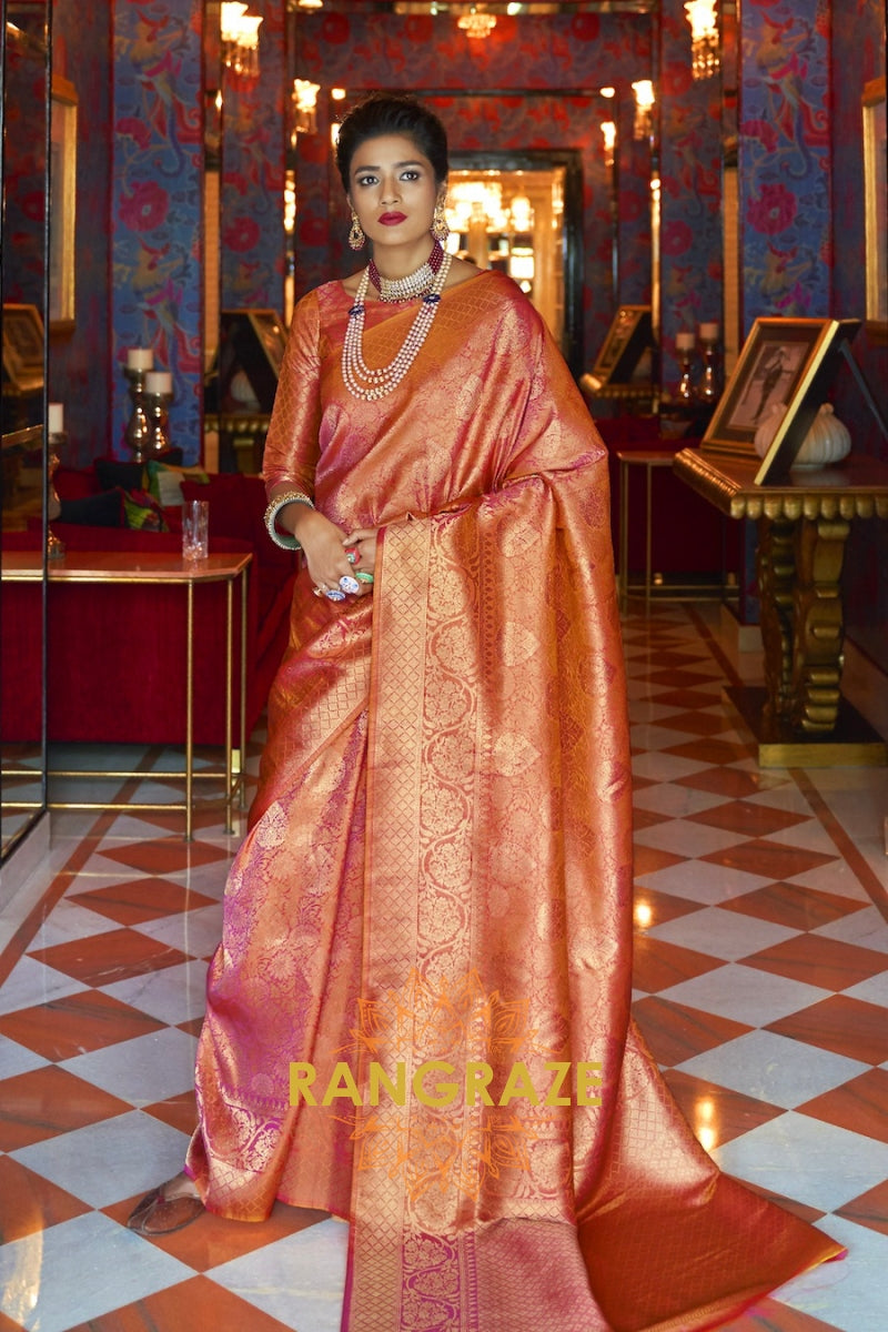 Royal Golden Peachy Orange Woven Kanjivaram Silk Saree