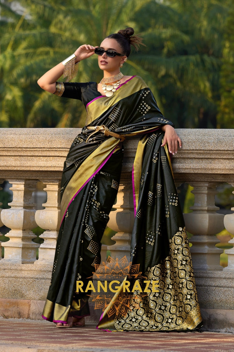 Midnight Black Banarasi Silk Saree with Gold Zari Border and Designer Blouse