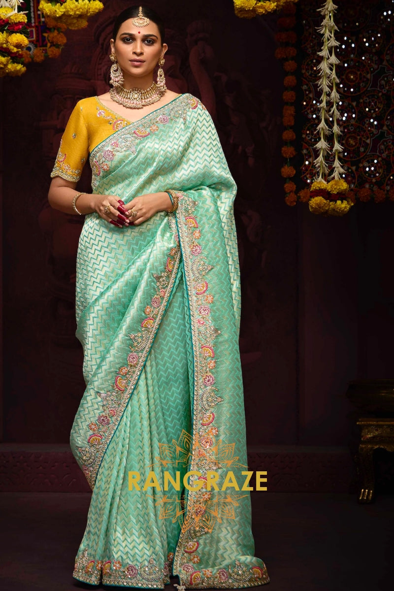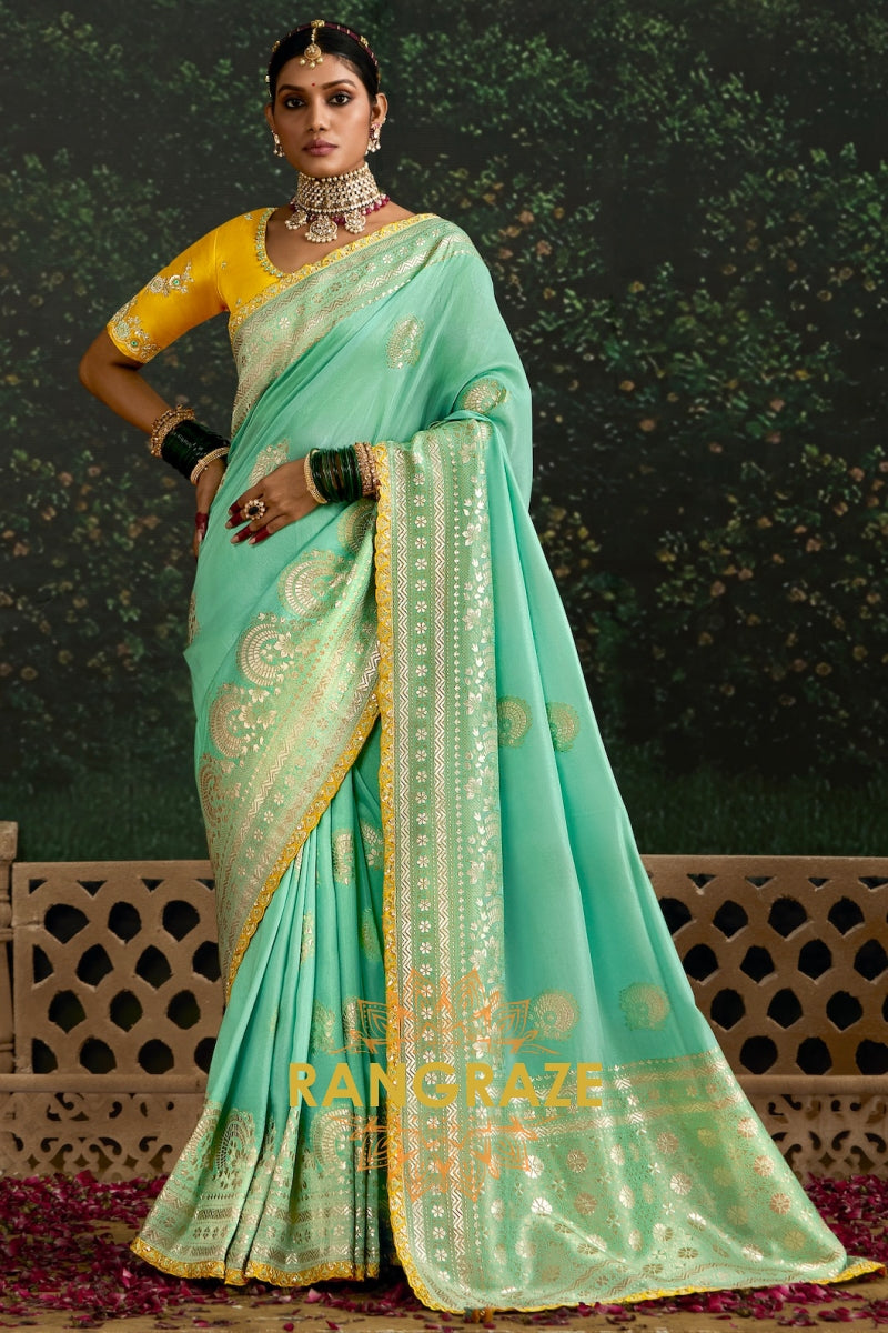 Mint Green and Mustard Yellow Designer Banarasi Silk Saree
