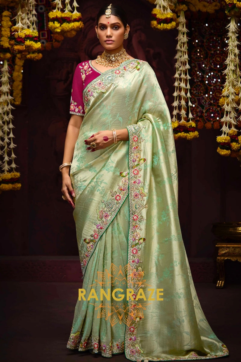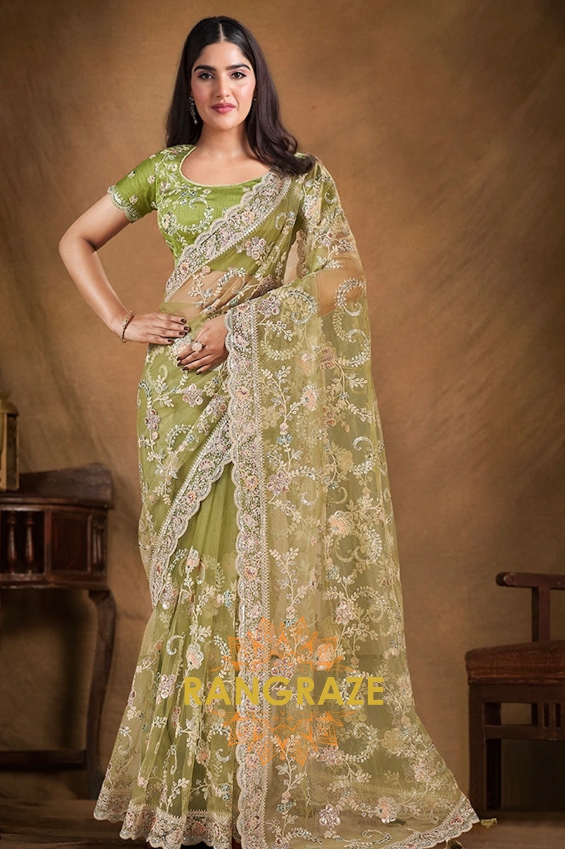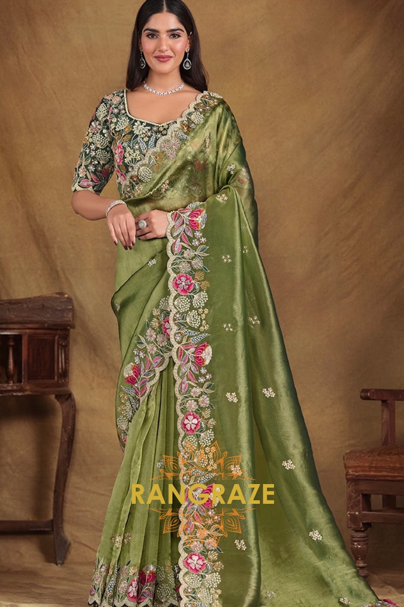 Olive Grandeur: Designer Embroidered Tissue Silk Bridal Saree