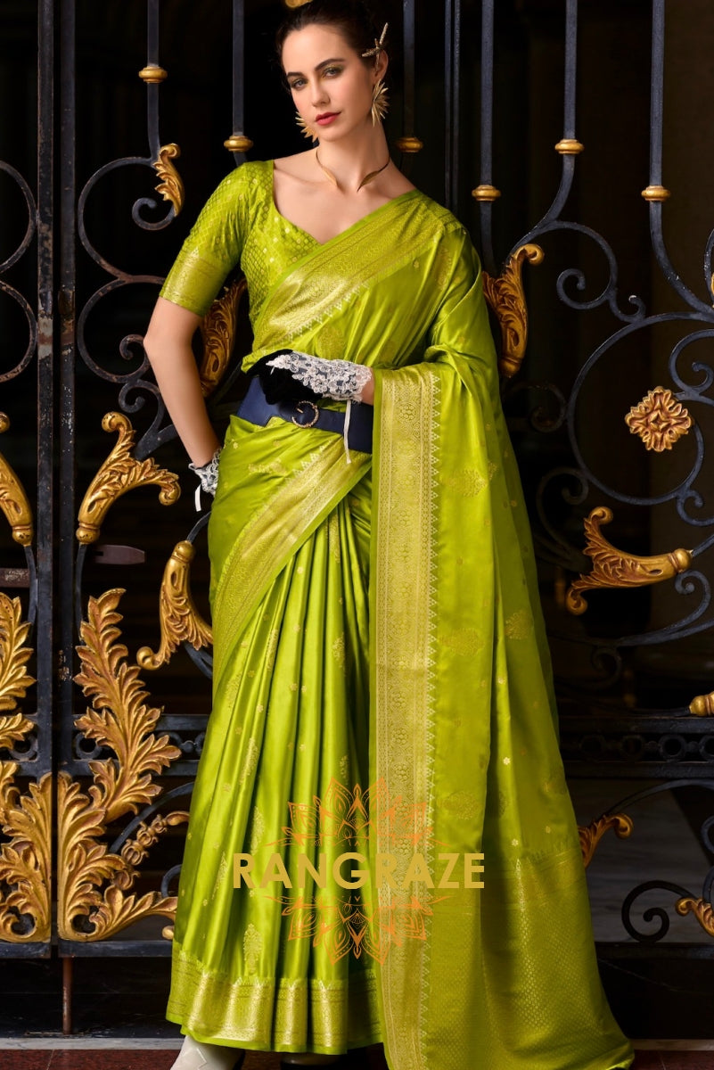 Green Olive Radiance Banarasi Silk Saree with Gold Zari Accents