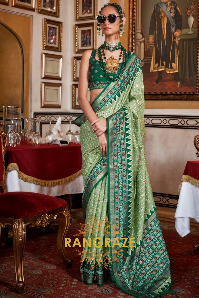 Celestial Sage Patola Silk Saree with Emerald Weaving Border