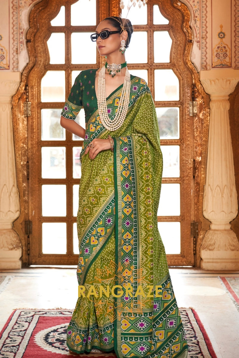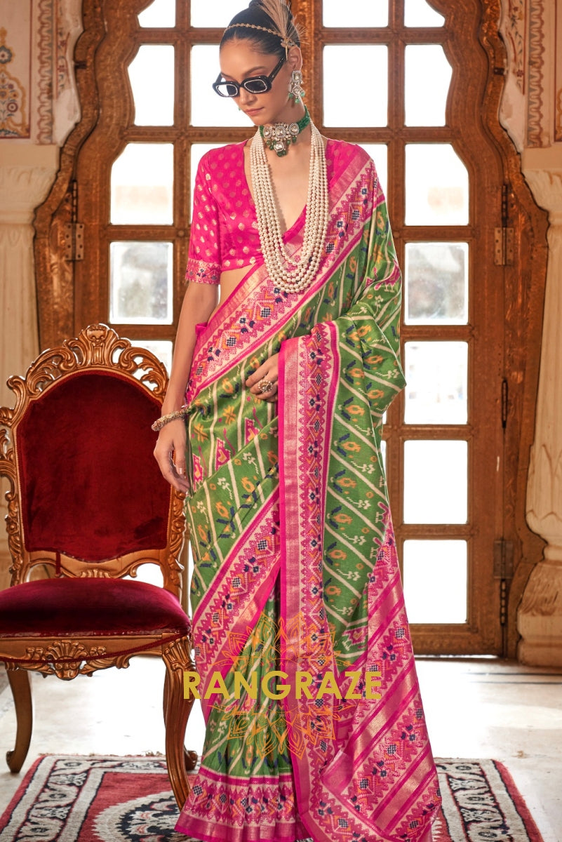 Bright Olive and Fuchsia Patola Silk Saree with Ornate Border